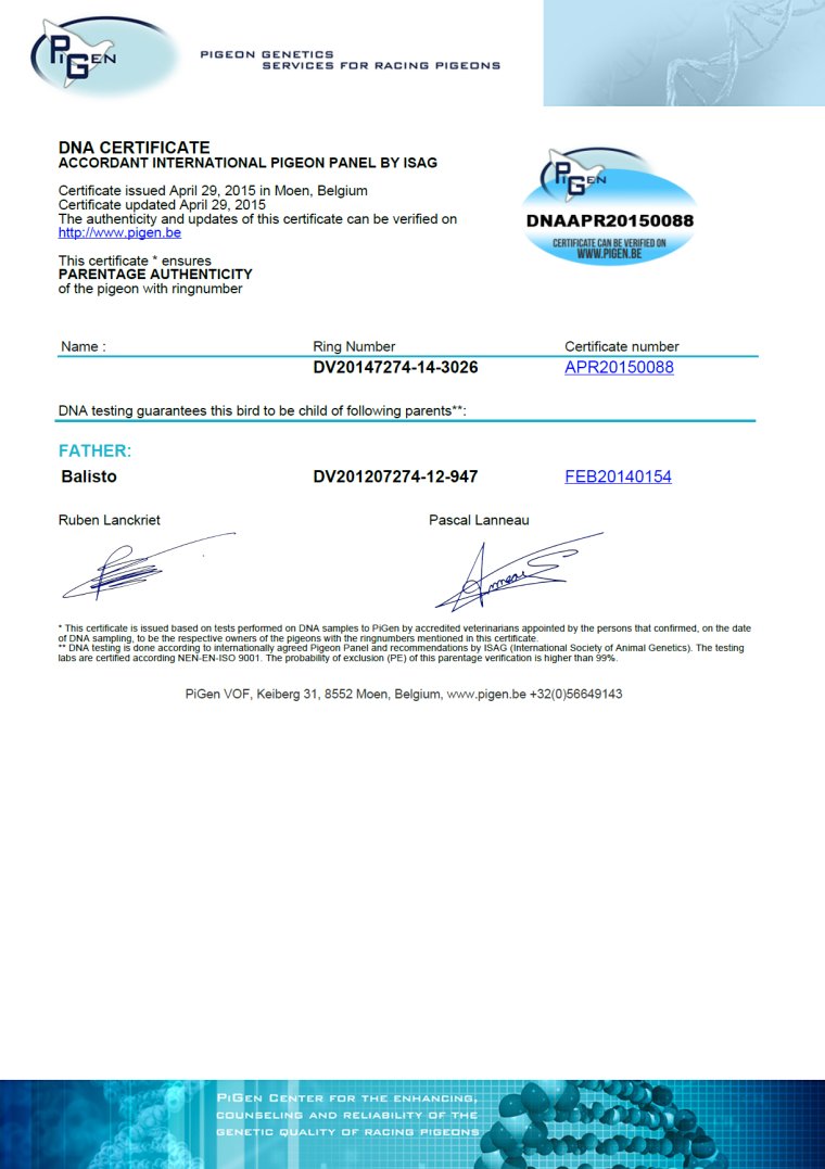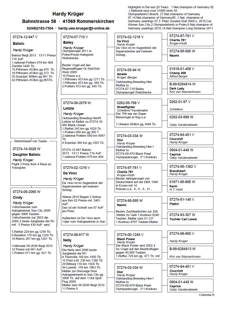 – ‘Balisto’; 1. Nat. Poitiers 5,426 birds … 1. ace cock yearlings RV 1. tour 2013