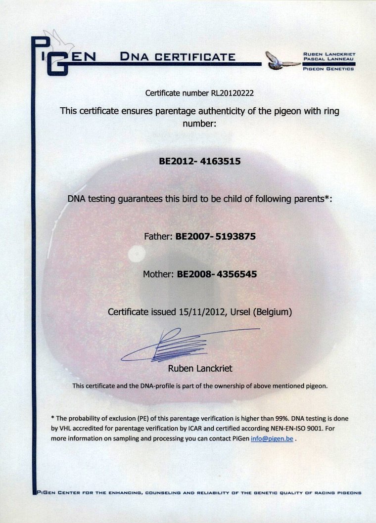 – the pedigree must be of upper class and the pigeon therefore has top DNA characteristics. Here too, only ‘the best of the best’ is good enough