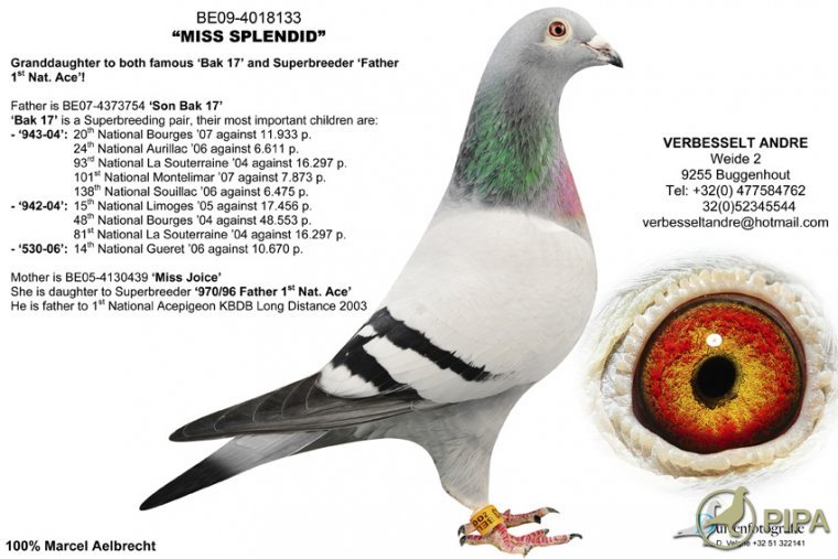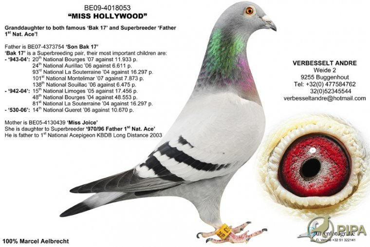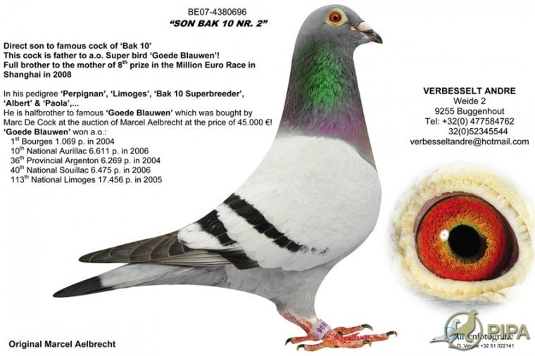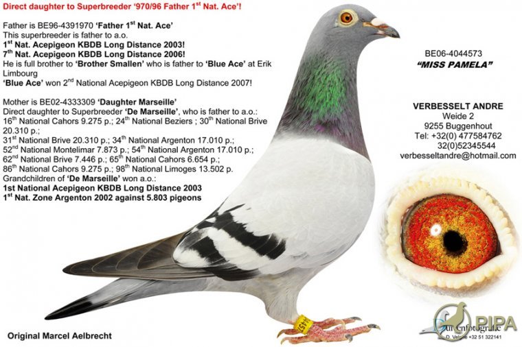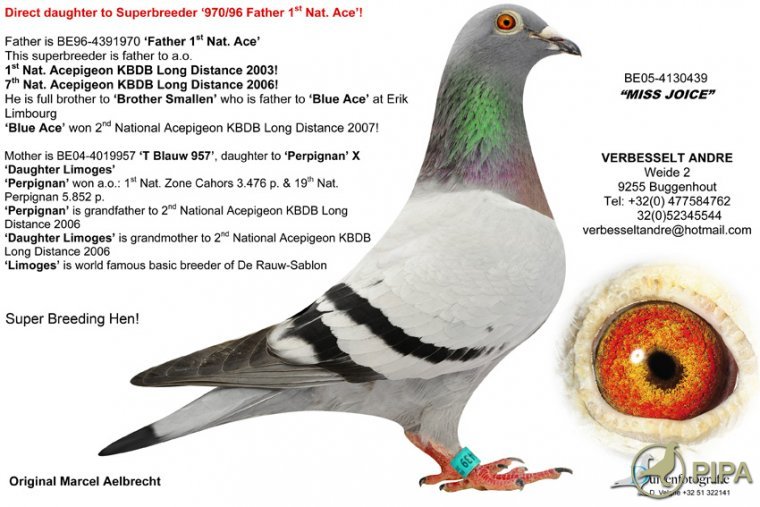 Andre Verbesselt si Marcel Aelbrecht … este mai mult decat un partnerioat de succes. Cu descendentii directi ai clasei mondiale mai sus enumerate, Andre Verbesselt are acum tot drumul liber in fata pentru a realiza spectacole in sportul cu porumbei … chiar si la nivel international. Acest lucru este dovedit de locul 8 obtinut in “cursa finala” de la One Million Euro Race – China 2008, si de locurile 10 si 12 in cursa Thailand Grand Pigeon 2009! Marcel Aelbrecht si Andre Verbesselt … ei nu sunt doar mana si manusa, ci si “clasa mondiala” din sertarul de sus. Cu cei 40 de porumbei adusi de la Aelbrecht, Andre este proprietarul “celei mai mari camere cu comori” … as spune o “mica avere”, sau mai degraba “mina de aur” cu porumbei Aelbrecht. Nu e de mirare ca lumea considera colonia lui Andre Verbesselt, in acest moment, drept cea mai mare si mai nobila “subsidiara” a lui Marcel Aelbrecht.