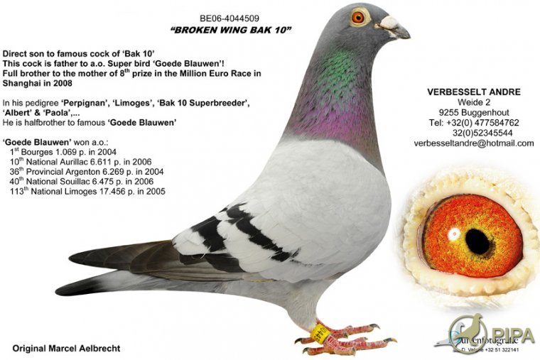 -‘Broken Wing Bak 10’ 509/06: half-brother of the star racers ‘Goede Blauwen’ and the ‘Irun’ (out the ‘Topkweker Bak 10’ 118/00 x ‘Daughter Perpignan 957/04’).