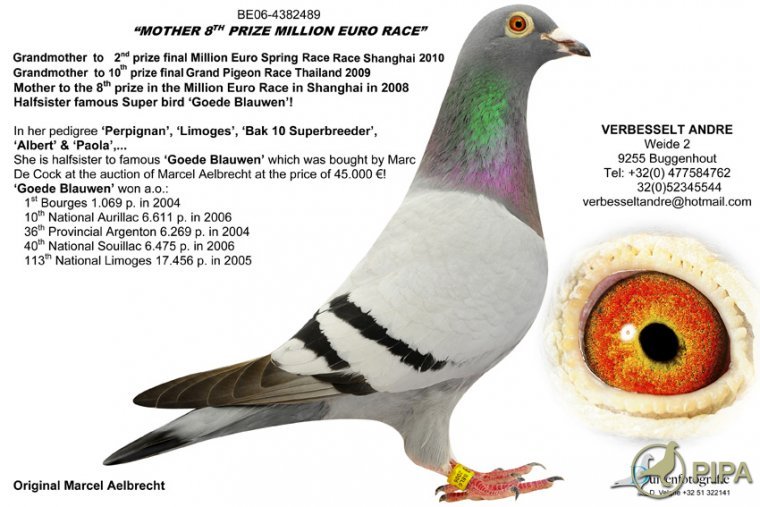 Adevarul e ca in ultimele sezoane, prietenul Andre Verbesselt, cu a sa crescatorie din Buggenhout, Flandra de Est, si-a croit un drum solid in misiunea de a-si face un “nume” in tarile asiatice. In anul 2008, porumbeii lui Andre au realizat o performanta remarcabila prin castigarea premiilor 8 si 45 la “One Million Euro Race”, de la Shanghai, China.