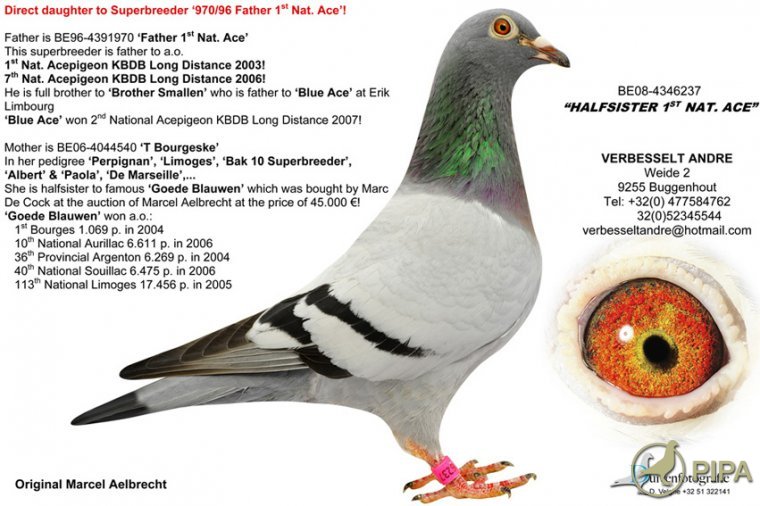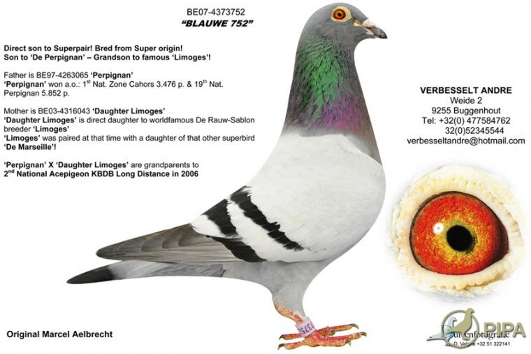 -‘Blauwtje 751/07’: daughter of the powerful top breeder the ‘Perpignan 065/97’ (1° Nat Zone B Cahors 3.476 p., 1° Vierzon 1.395 p., 19° Nat Perpignan 5.852 p…. and grandfather 2° Nat Ace pigeon ‘Grand Middle Distance’ by Louis Vd Eynde) x ‘Daughter Limoges 043/03’ (super breeding hen out wonder breeder the ‘Limoges 261/91’ x ‘Daughter Marseille 309/02’).