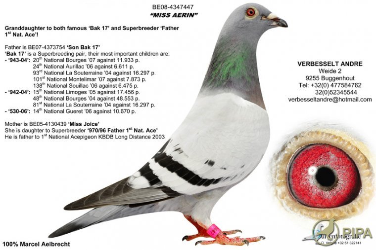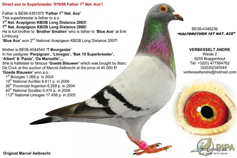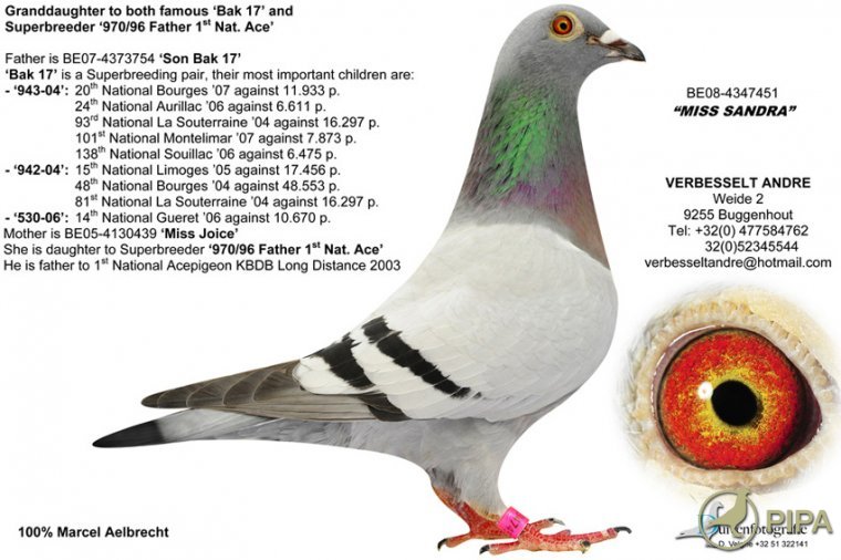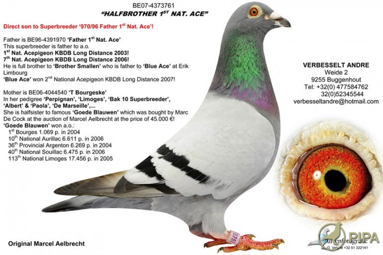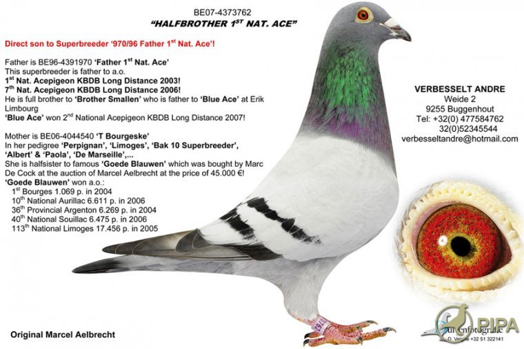 There is also a treasure of breeding gold from the world famous top couple from Marcel Aelbrecht in the lofts of sport friend Andre Verbesselt. The ‘Duiver Bak 17’ 378/02 is not only a full brother of ‘Blue Ace’ or the 2° Nat Ace pigeon Long Distance KBDB 2007 by E.Limbourg… he is also son of ‘Brother Smallen 848/00 (sold for a sloppy 30.000 euro in the auction of Eric Limbourg… as son of the ‘SUPERKWEKER 548/91’ x ‘Golden Lady 368/93) who was coupled with ‘Daughter Dromer 665/01, a golden breeding mother (as daughter of the unprecedented ‘Dromer 519/99’ x ‘Daughter Limoges 805/00’). the ‘Mother Bak 17 061/99’ then comes out ‘Den Yzeren 044/93’ (father 1° Nat Perpignan 5.855 p… and coming out a half-sister ‘Albert’ , the cock of the ‘Dream Couple’) coupled with ‘Sister Crack 205/94’ (full sister of the famous ‘Crack 066/91’ and half-sister of the ‘Cerafin’… and also stemming from a half-sister ‘Albert’)! A breeding couple of exceptional ‘class’… because the famous ‘Dream Couple’ is worked into the pedigree no less than 6 times! Here also lies the ‘domination’ of the ‘Ace pigeon couple’ at the basis of a new generation of ‘wonder pigeons’!