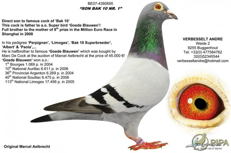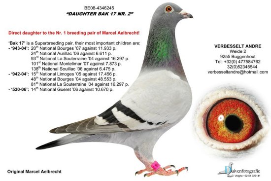 -‘Cock BAK 17’ by Marcel Aelbrecht: exceptional breeding talent and father of the ‘Favourite Bak 17’, ‘the 530’, the ‘942-04’… superior racing pigeons that gave Marcel Aelbrecht world fame!