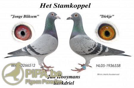Jan Hooymans detine unele dintre cele mai bune perechi de imperecheat. Ca reporter PIPA am vizitat foarte multe porumbarii, insa niciodata nu am vazut o pereche atat de buna. Aceasta este alcatuita din Jonge Bliksem (porumbelul lui Gaby Vandenabeele) si Dirkje (porumbita lui Gerard Koopman). Dirkje este ultima fiica a lui Kleine Dirk. Aceasta pereche a dat nastere multor pasari de succes care au devenit la randul lor parinti excelenti. Dupa o vreme au decis sa mute descendentii pentru curse in crescatorie. Ceea ce este de inteles, numarul puilor pe care ii poti creste este limitat. Descendentii si ascendentii au devenit o parte integrata a porumbariei, cu aceasta colectie isi poate realiza visul: sa transforme perechea intr-un fenomen international. Acesta vrea sa demonstreze ca poate creste porumbei extraordinari in 3 generatii. Acestea sunt tipurile de curse in care vrea sa evolueze: