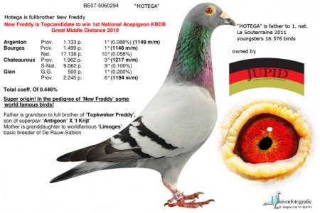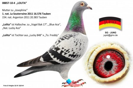 Cel mai mare succes al coloniei Jung-Jupid isi are originile in Tessenderloo, Belgia. O selectie atenta de pui a fost mutata in Belgia la campionul Verreckt-Ariën, pentru a demonstra ceea ce pot … unul dintre ei a fost DV08857-11-387 ‘Josephine’, cel mai rapid pui belgian din cursa nationala de la La Souterraine si castigatoarea altor premii. Rezultatele ei din 2011 sunt: